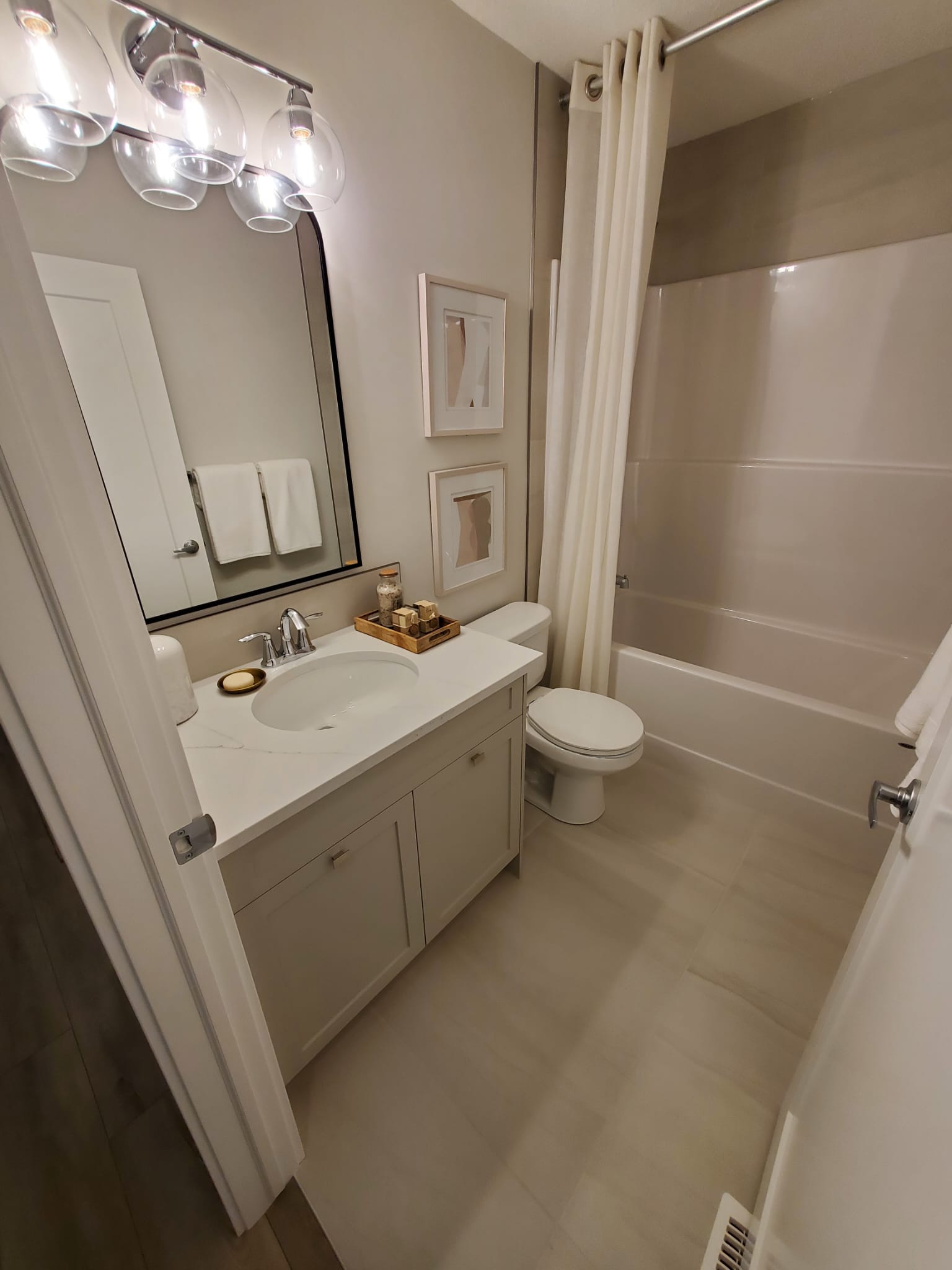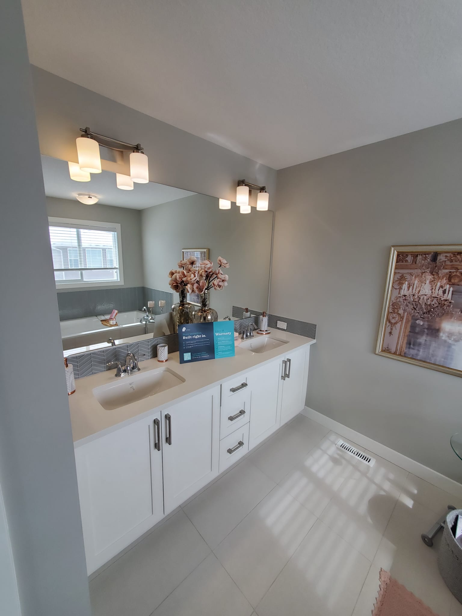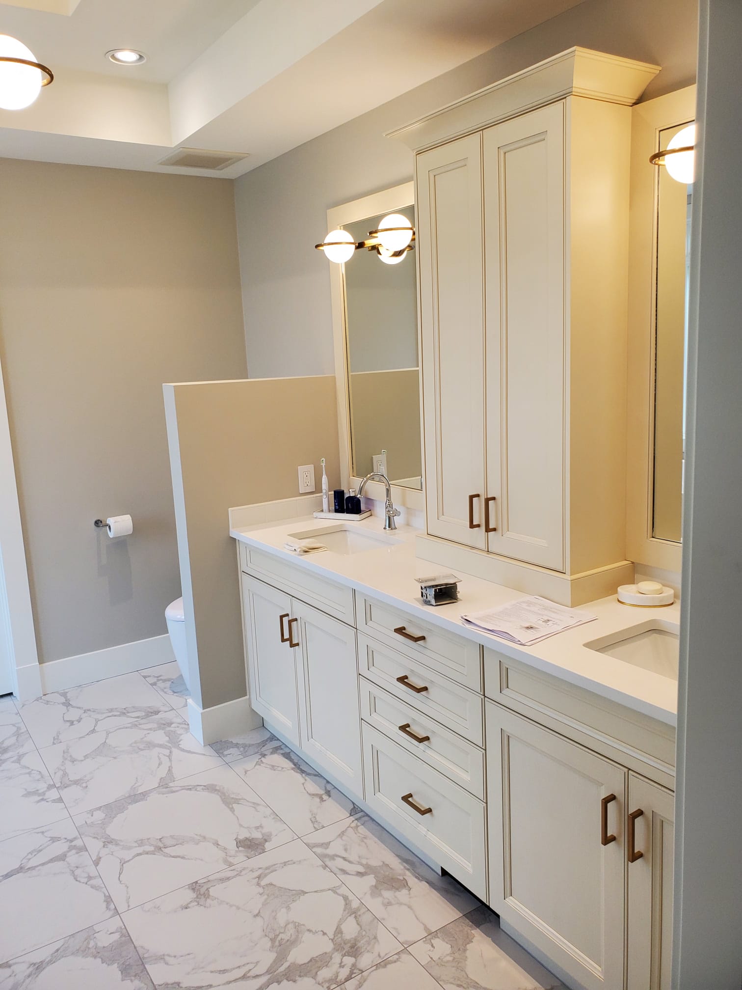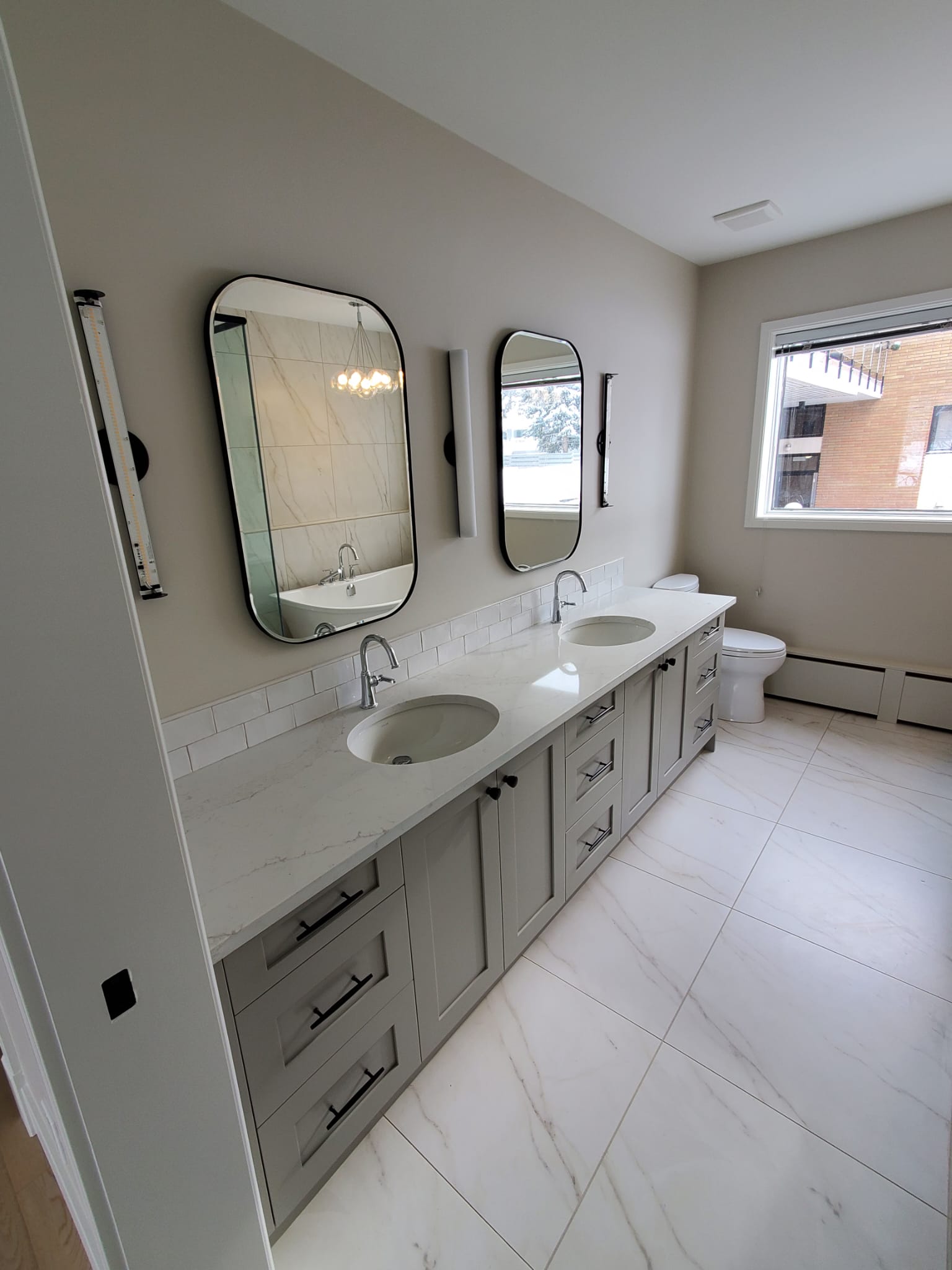 Install new fixtures, cabinetry, flooring, and complete tiling work.